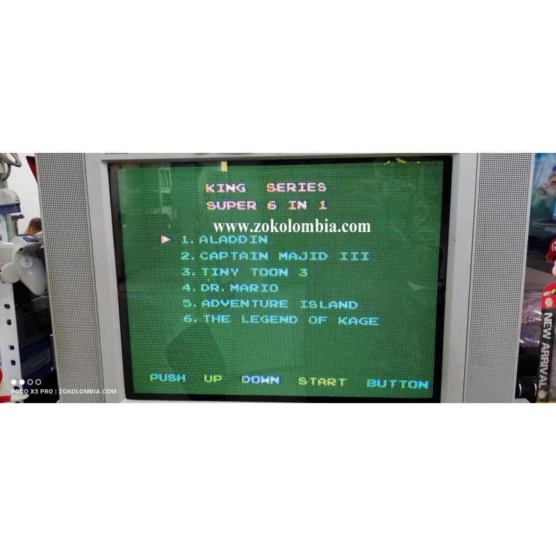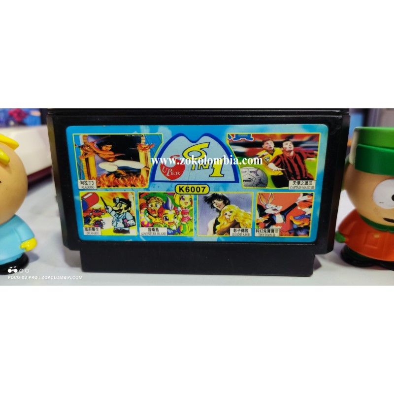 Se vende juego super 6 en 1, casette para la consola Family Computer, el casette trae los siguientes juegos: Adventure Island 1 o Islander, Aladdin, Dr Mario, Tuny Toons 3 o Bugs Bunny, Captain Majid 3 y The Legend of Kage. Los juegos funcionan perfectamente, en la ciudad de Bogotá se puede entregar ensayado.