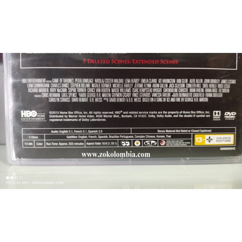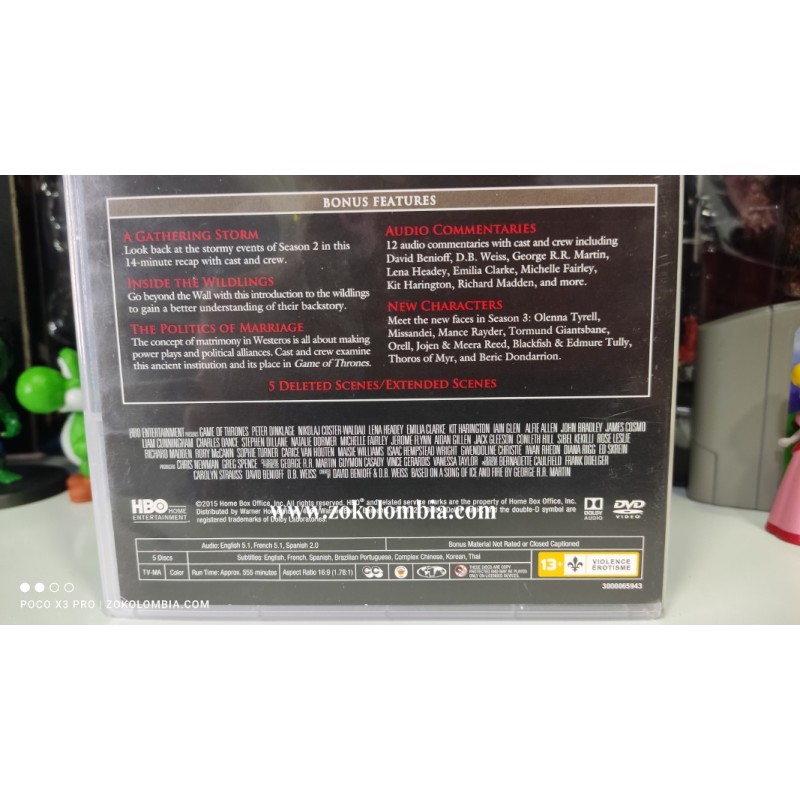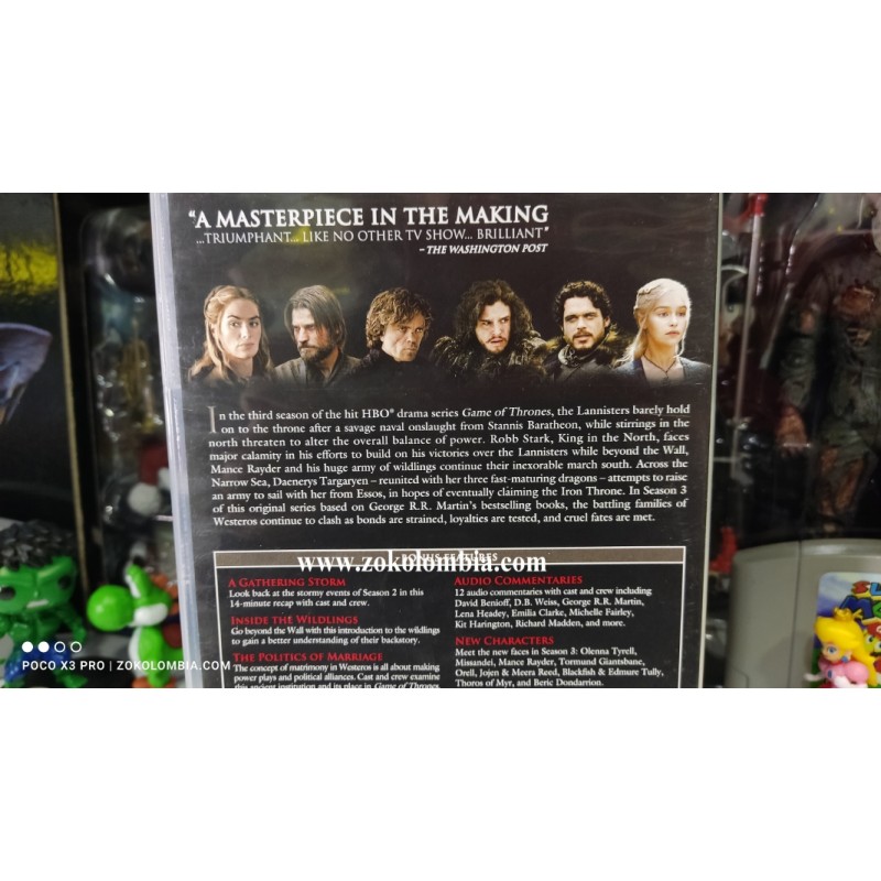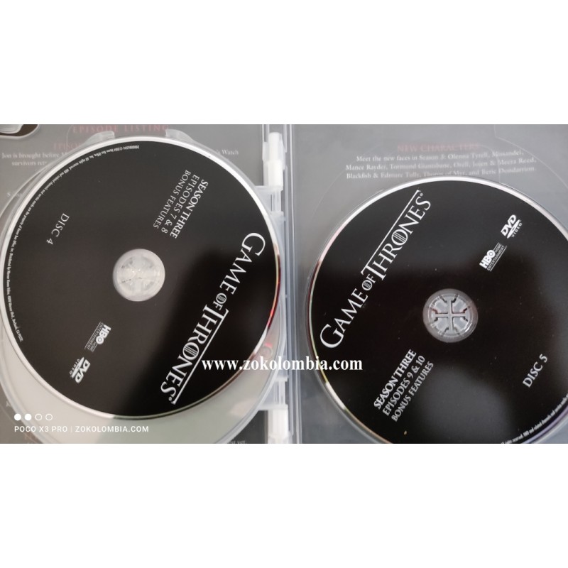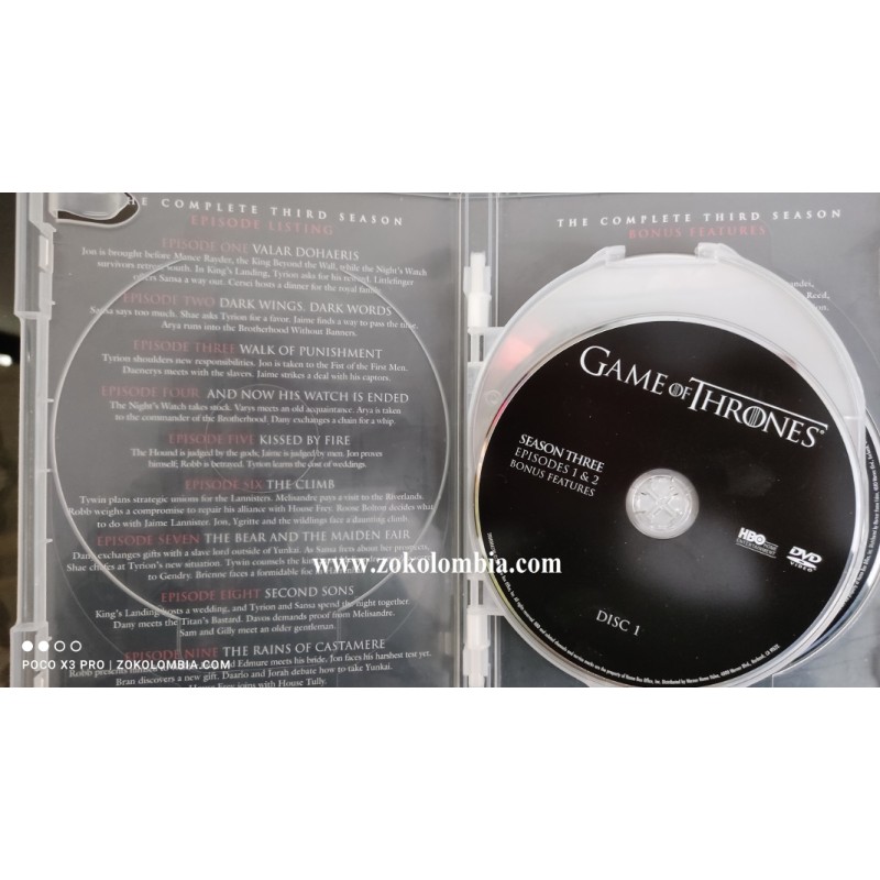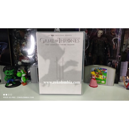 Se vende una de las mejores series de los últimos tiempos, la tercera temporada completa de Game Thrones, totalmente original, formato DVD, 5 discos totalmente funcionales en muy buen estado, audios en ingles y español, subtítulos en español, estuche plástico. Fotos reales del producto, se puede recoger en la oficina o enviar a domicilio.