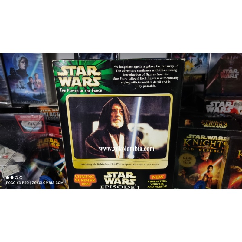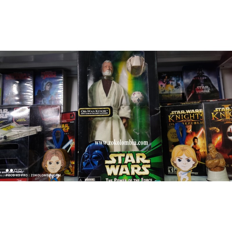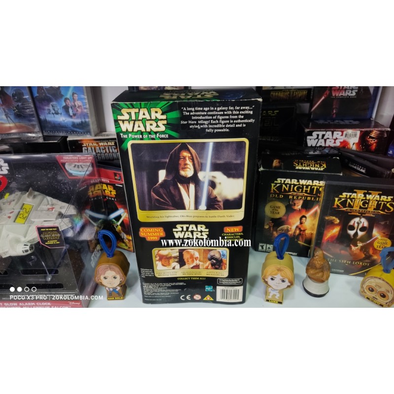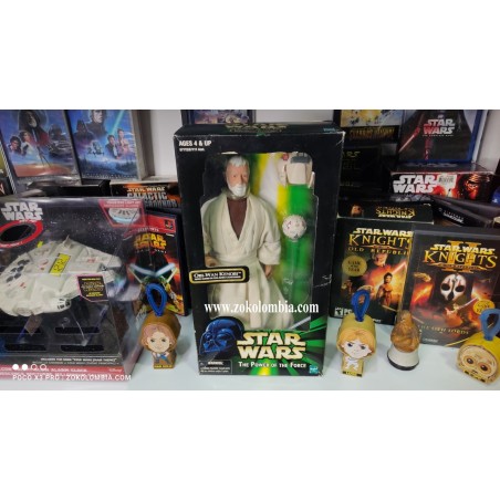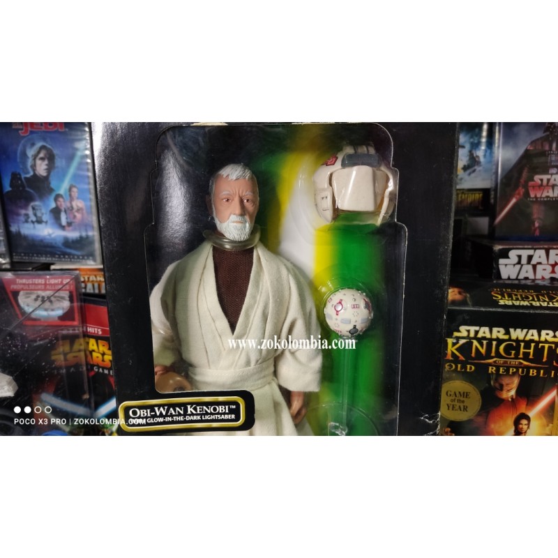 Figura totalmente original marca Hasbro, totalmente nueva y sellada, figura completa con todos sus accesorios. Personaje de las películas de Star Wars, personaje Obi Wan Kenobi, figura de 30 centímetros, serie Star Wars the power of the force, material plastico y tela, año 1998, caja con ventana, se entrega glow in the dark lightsaber, lightsaber, ropa hecha en tela. Figura con altos detalles estéticos, especial para coleccionistas, se puede recoger en la oficina o enviar a domicilio.