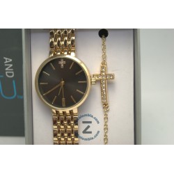 Presentamos el sofisticado set de reloj y pulsera para damas de la reconocida marca Time And True. Este conjunto incluye un reloj analógico de diseño refinado en color dorado, acompañado de una pulsera a juego con un delicado detalle en forma de cruz, perfecto para complementar tu estilo diario o para ocasiones especiales. Fotos reales del producto, se puede recoger en la oficina o enviar a domicilio.