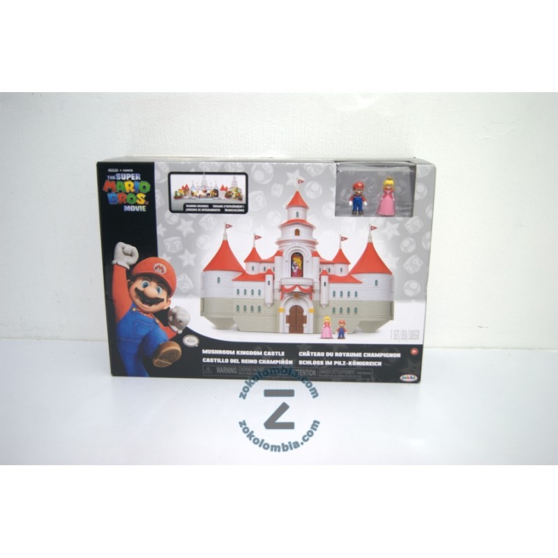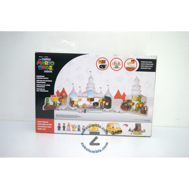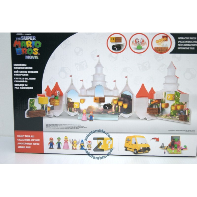 Castillo del Reino Champiñón: El set incluye un detallado castillo con torres, puertas y banderas, fiel al icónico diseño del Reino Champiñón en la película.