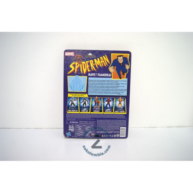 Información adicional: En la parte trasera del empaque se incluye una breve biografía del personaje Hammerhead, junto con imágenes promocionales de otras figuras de la misma serie, como Spider-Armor Mk I, Hobgoblin, y Marvel's Shocker.