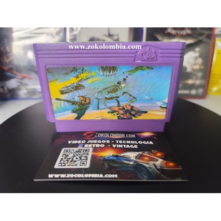 Este cartucho contiene un juego de acción clásico de desplazamiento lateral en el que el jugador debe enfrentar hordas de enemigos, helicópteros y tanques en diversos escenarios tropicales y de combate. Inspirado en los míticos títulos de guerra de la era de los 8 bits, está diseñado para brindar emoción desde el primer momento. Incluye instrucciones de trucos en la parte trasera para obtener 30 vidas adicionales.