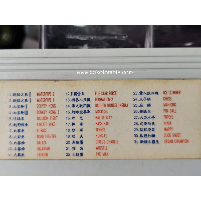 Revive la era dorada de los videojuegos con este cartucho 31 en 1, que incluye títulos icónicos como Donkey Kong, Balloon Fight, Excitebike, Ice Climber, Popeye, Galaxian, Kung-Fu, entre otros. Ideal para consolas tipo Family Game (Famicom) o NES modificadas para cartuchos de 60 pines. ¡Diversión asegurada por horas!
