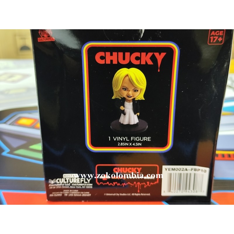 Figura coleccionable Tiffany novia de Chucky (Vinyl Figure by CultureFly), inspirada en la temible y encantadora novia del muñeco asesino más famoso del cine. Esta figura de vinilo presenta a Tiffany Valentine, con su característico cabello rubio, vestido blanco de novia y chaqueta de cuero negra, lista para sembrar el caos junto a su amado Chucky.