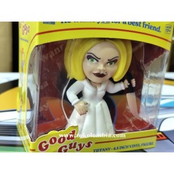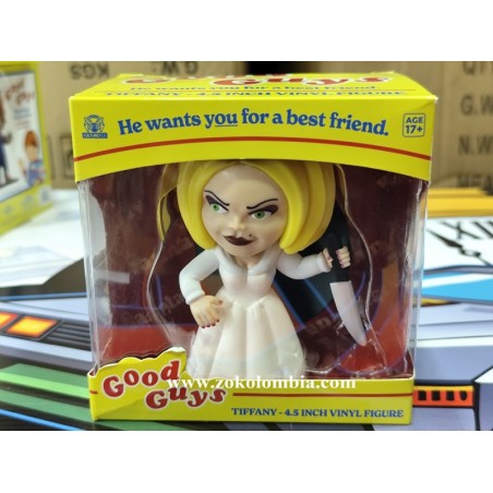 Figura coleccionable Tiffany – Good Guys Edition (Vinyl Figure by CultureFly), inspirada en la icónica novia de Chucky. Esta edición especial presenta a Tiffany con un diseño tipo “Good Guys”, combinando el estilo clásico del muñeco asesino con el encanto letal de su compañera. Viste su característico vestido blanco de novia y sostiene un cuchillo listo para la acción, todo en un empaque retro que rinde homenaje a los juguetes originales de la saga Child’s Play.