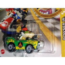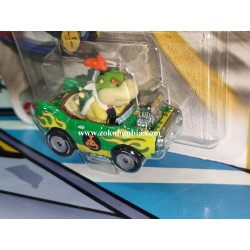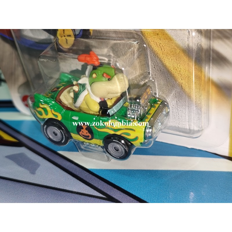 Inspirado en el popular videojuego de Nintendo, este vehículo de colección captura toda la acción de las carreras más locas del Reino Champiñón. Su diseño metálico verde con detalles de llamas y el emblema de Bowser lo convierten en una pieza imperdible para fanáticos y coleccionistas.