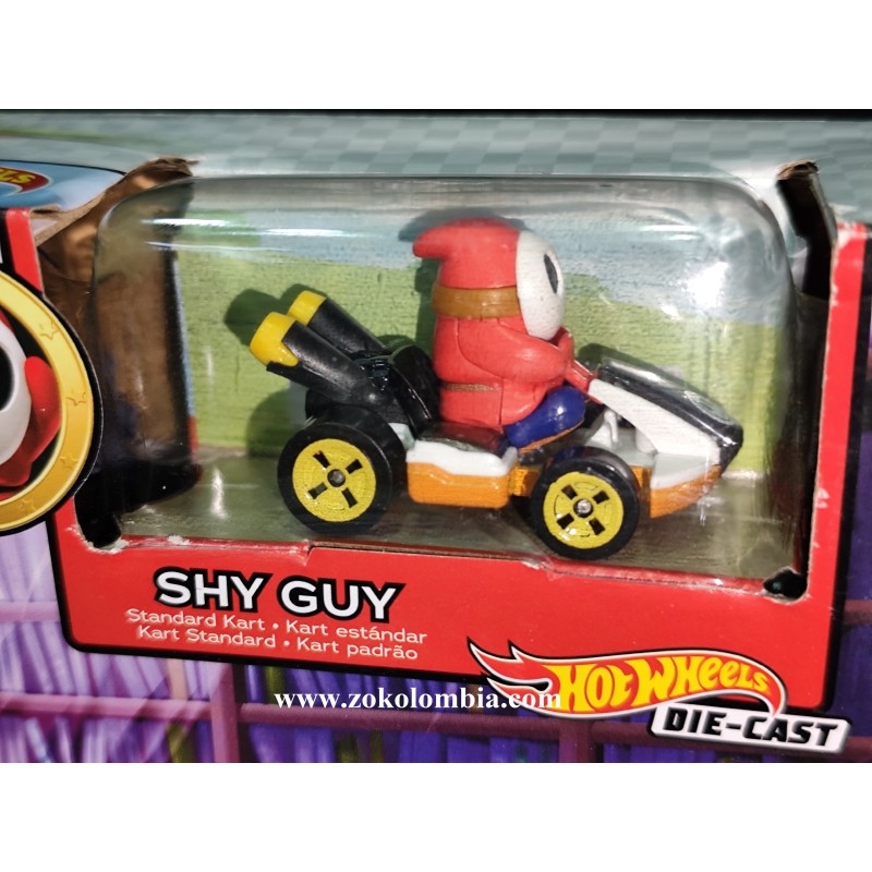 Incluye un vehículo die-cast de Shy Guy listo para la carrera, un lanzador de hongo (Mushroom Slam Launcher) y una pista con obstáculos móviles que pondrán a prueba tus reflejos. ¡Evita ser golpeado por Boo y llega primero a la meta!