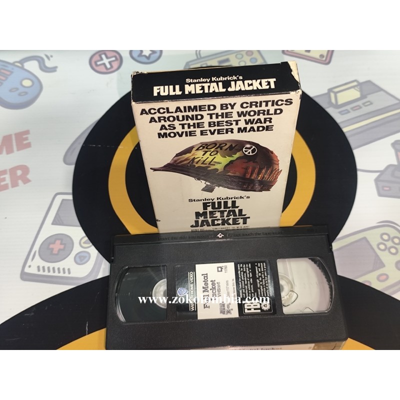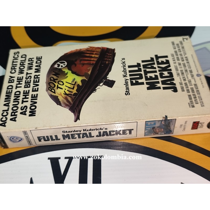 Cinta VHS original con su caja completa y arte gráfico original, con el icónico casco militar con la frase “Born to Kill”. Presenta ligeros detalles de uso, propios de un artículo vintage auténtico.