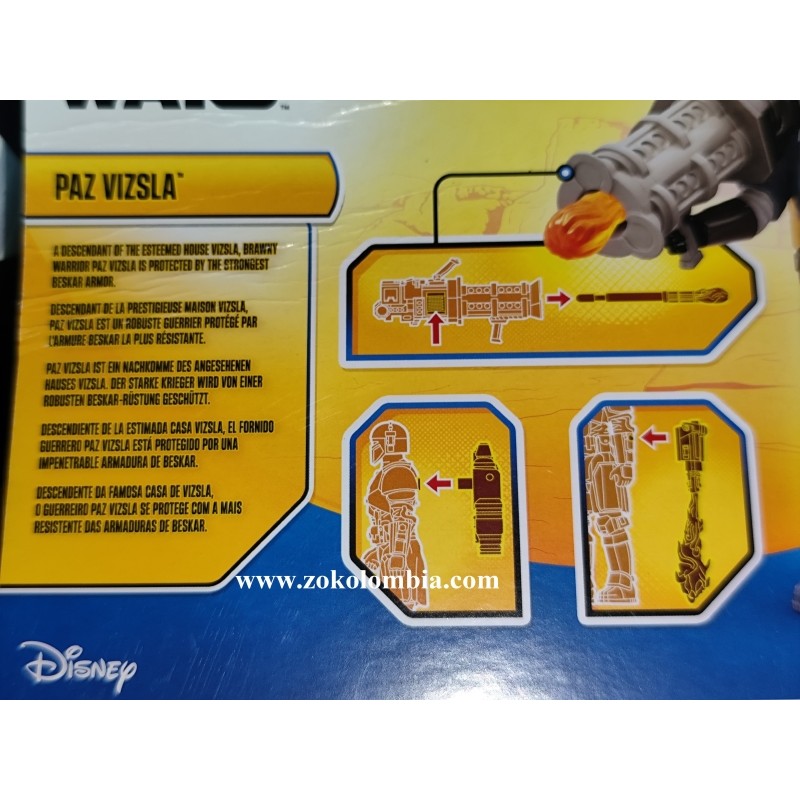 Paz Vizsla es descendiente de la Casa Vizsla, una línea de guerreros mandalorianos reconocida por su valentía y fuerza. Equipado con una armadura completa de beskar, este personaje se destaca por su poderoso cañón bláster con efecto de disparo y su mochila propulsora, ideales para recrear las batallas más épicas del universo galáctico.