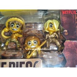 Inspirado en la exitosa serie One Piece de Netflix, este set rinde homenaje a la icónica tripulación de los Piratas del Sombrero de Paja, liderados por Monkey D. Luffy. Cada figura representa a un miembro clave en su versión dorada, simbolizando los tesoros y la camaradería que definen su travesía por los mares en busca del legendario One Piece.