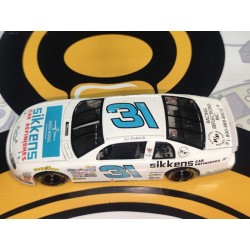 ¡Un tributo a la elegancia y la potencia en la pista! Este Chevrolet Monte Carlo #31 Sikkens Car Refinishes, asociado al legendario Dale Earnhardt Jr., es una pieza de colección que resalta por su diseño limpio, su combinación de colores blanco y azul celeste, y el detalle característico de los autos de competición de la NASCAR de finales de los 90.