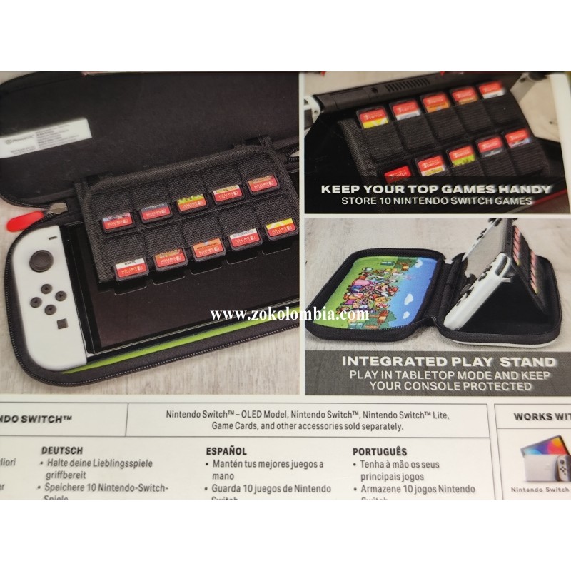Este estuche ultradelgado ofrece una protección de perfil bajo, perfecta para llevar tu consola de manera segura sin ocupar mucho espacio. Su interior acolchado y compartimientos organizados permiten almacenar hasta 10 cartuchos de juego y mantenerlos siempre a la mano. Además, incluye un soporte integrado (Play Stand) para jugar en modo de mesa sin sacar la consola del estuche.