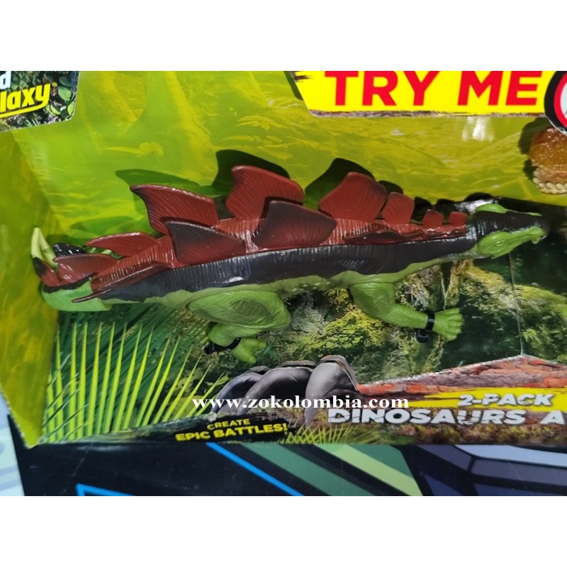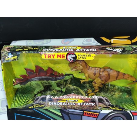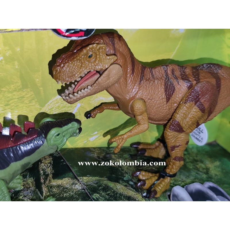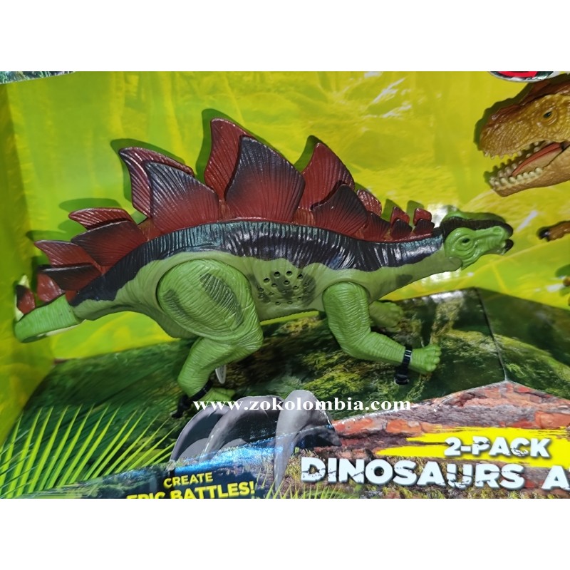El paquete incluye dos figuras altamente detalladas: un Tiranosaurio Rex articulado con función de mandíbula móvil y sonidos, y un estegosaurio articulado.