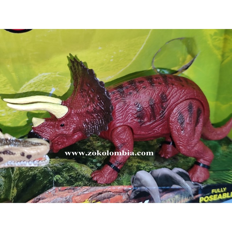 Incluye dos dinosaurios articulados: uno tipo Allosaurus/depredador y un Triceratops rojo.