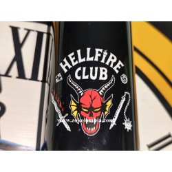 Este termo es de color negro brillante, con diseños impresos del logo clásico de Stranger Things por un lado y el emblemático emblema del Hellfire Club por el otro.