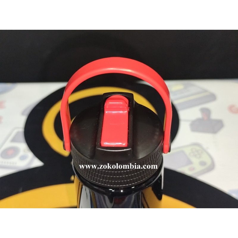 Su tapa está diseñada con sistema abatible para beber fácilmente y un asa resistente en color rojo para transportar cómodamente en mochilas, manos o colgar en sujetadores.