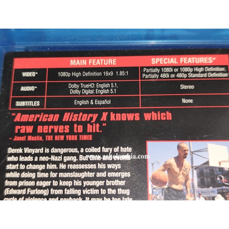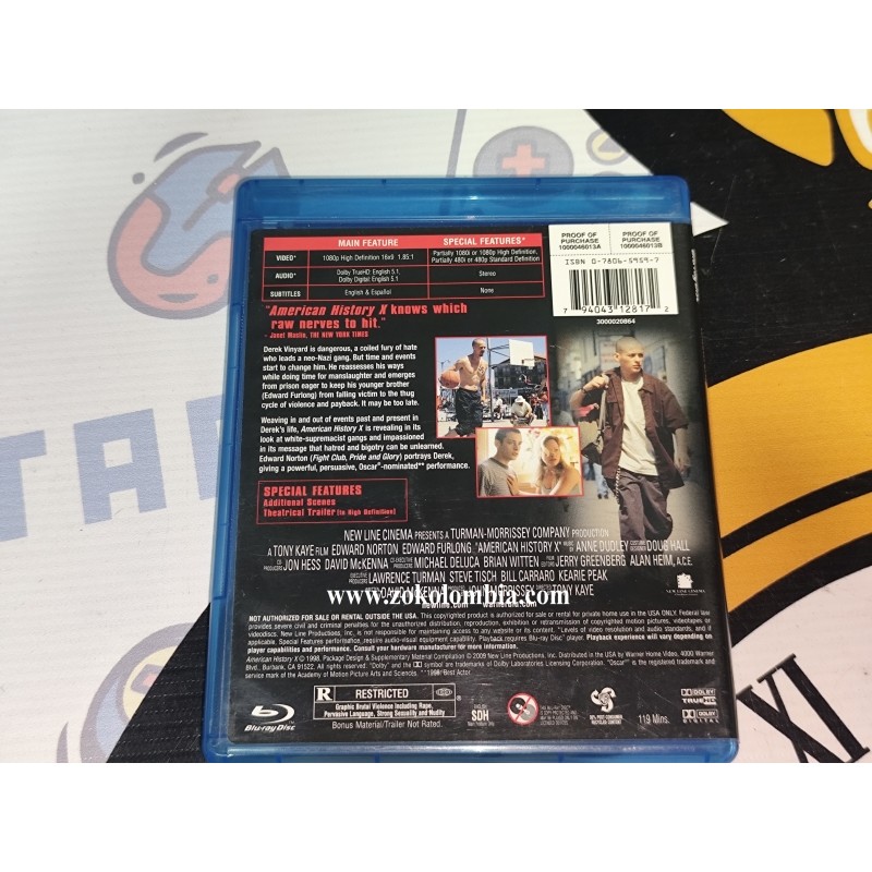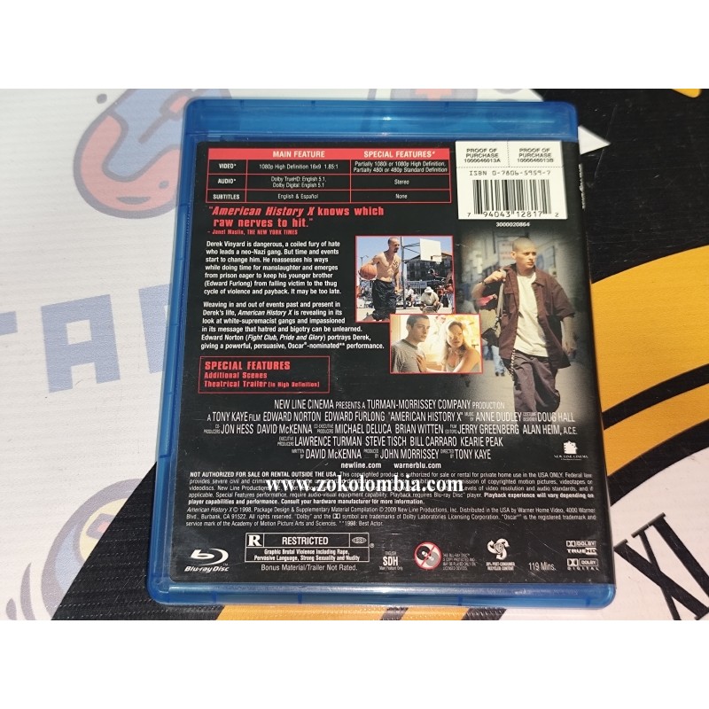 Características Principales Formato Blu-ray original en alta definición. Título: American History X. Protagonistas: Edward Norton, Edward Furlong. Género: Drama / Crimen. Duración aproximada: 119 minutos. Video: 1080p High Definition 16:9. Audio: Dolby TrueHD / Dolby Digital 5.1. Idiomas: Inglés. Subtítulos: Inglés y Español. Clasificación: R (contenido fuerte y violencia). Incluye contenido adicional como escenas adicionales y tráiler cinematográfico.