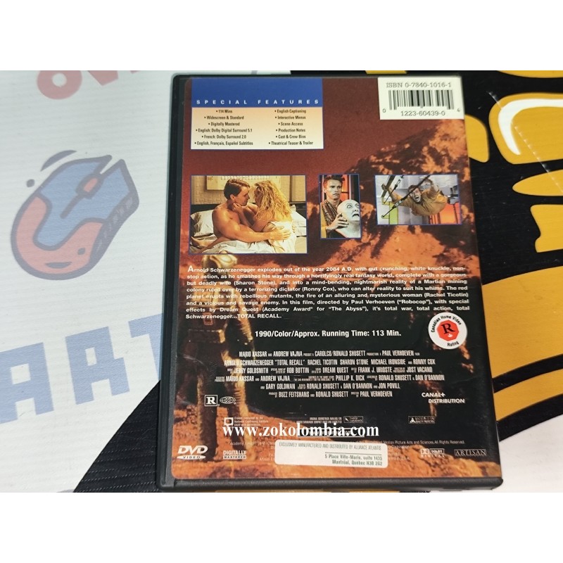 Características Principales Formato DVD Video original. Título: Total Recall. Protagonista: Arnold Schwarzenegger. Director: Paul Verhoeven. Género: Ciencia ficción / Acción / Thriller. Año: 1990. Duración aproximada: 113 minutos. Clasificación: R. Presentación en formato widescreen y estándar. Audio Dolby Digital Surround 5.1 y 2.0. Idiomas: Inglés y Francés. Subtítulos: Inglés, Francés y Español. Edición remasterizada con características especiales que incluyen menús interactivos, acceso a escenas, notas de producción, reparto y avances teatrales.