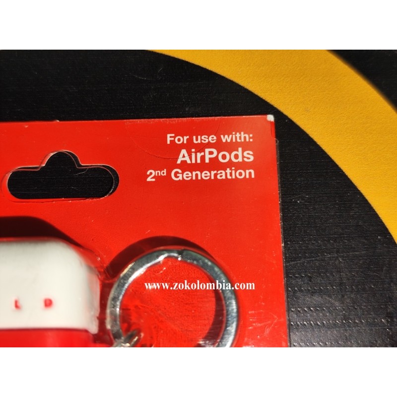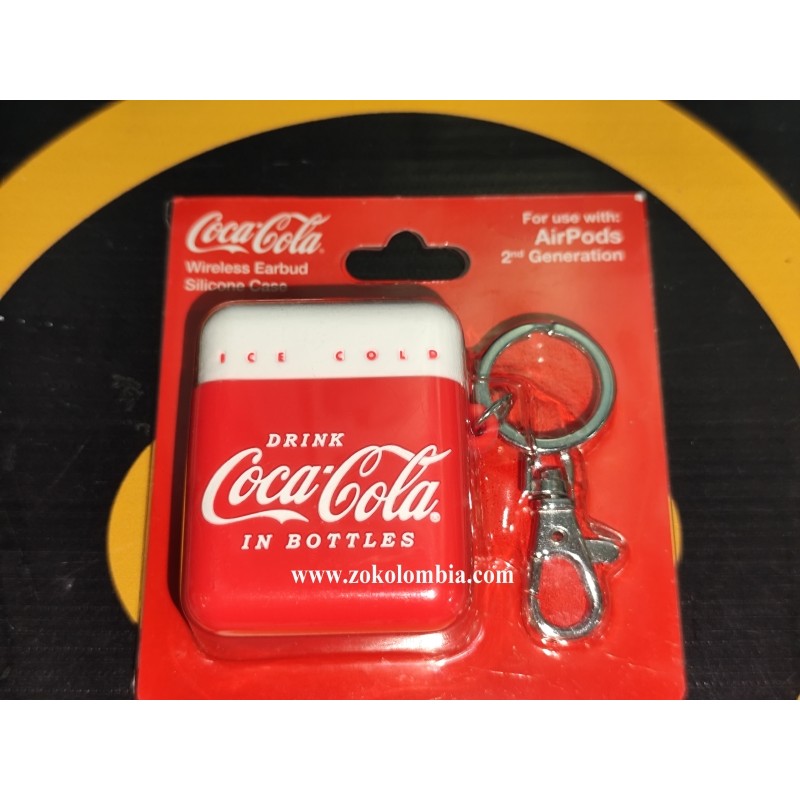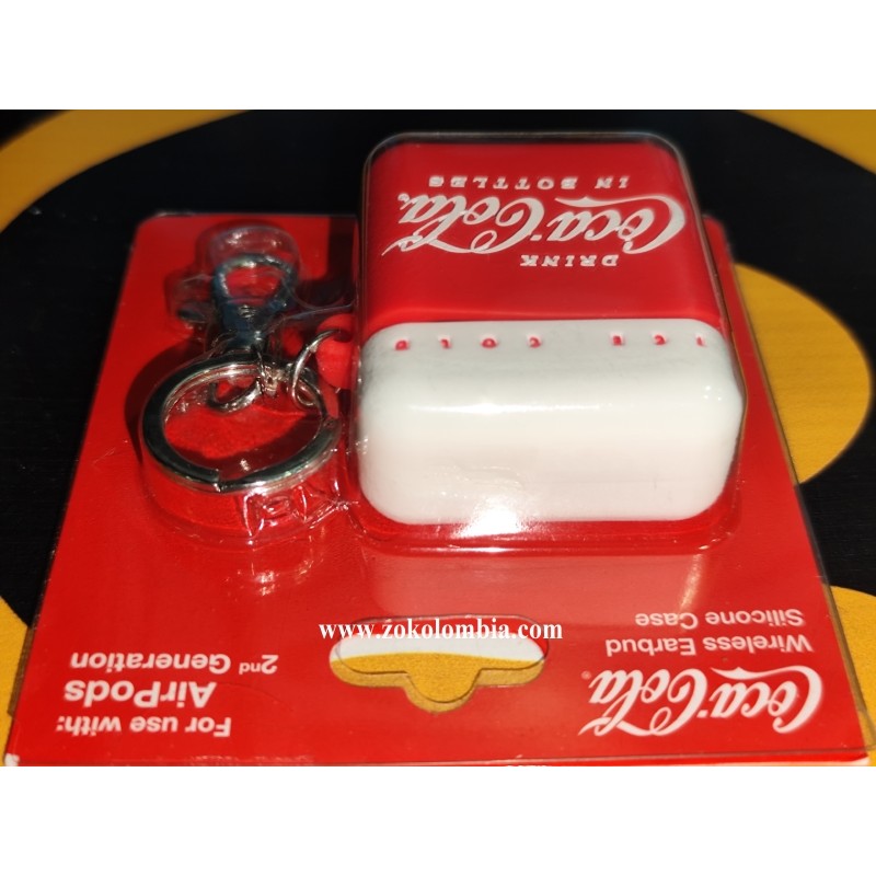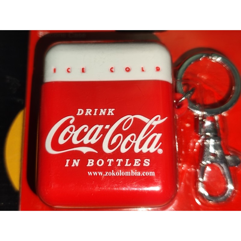 Protector de silicona original Coca-Cola para AirPods 2da Generación, con diseño clásico “Drink Coca-Cola in Bottles” en color rojo y blanco, inspirado en la icónica imagen vintage de la marca. Incluye aro metálico y gancho tipo mosquetón para fácil transporte y máxima protección diaria.