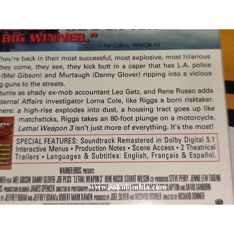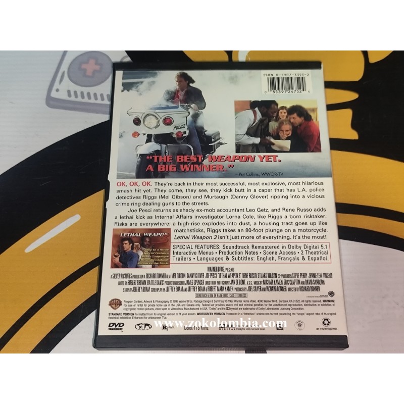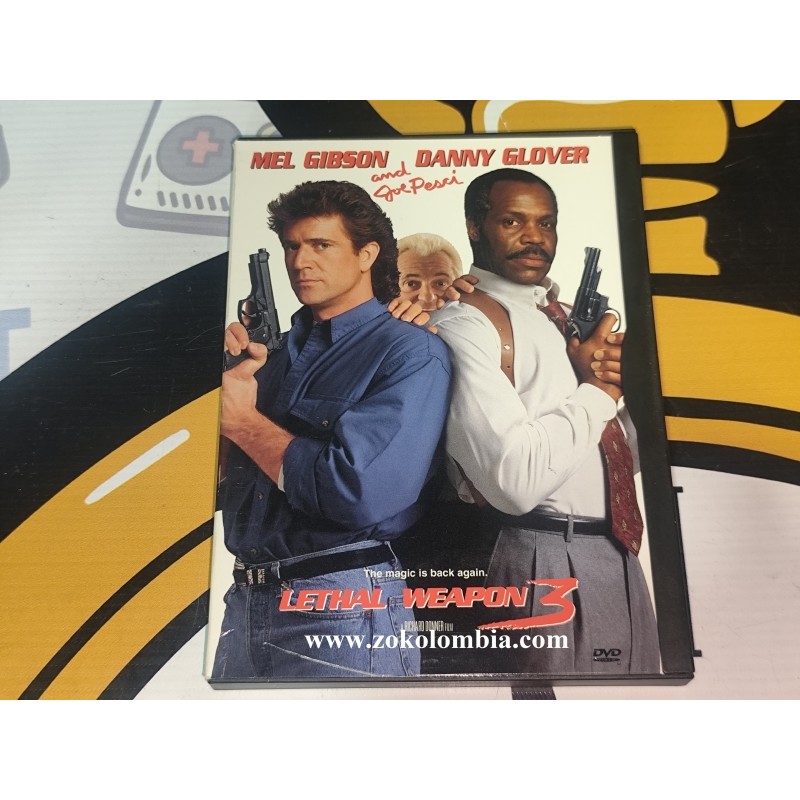 Película original en formato DVD Lethal Weapon 3, protagonizada por Mel Gibson, Danny Glover y Joe Pesci. Esta es la tercera entrega de la icónica saga policial de acción de los años 80 y 90, presentada en su edición física original, ideal para coleccionistas y amantes del cine de acción clásico.
