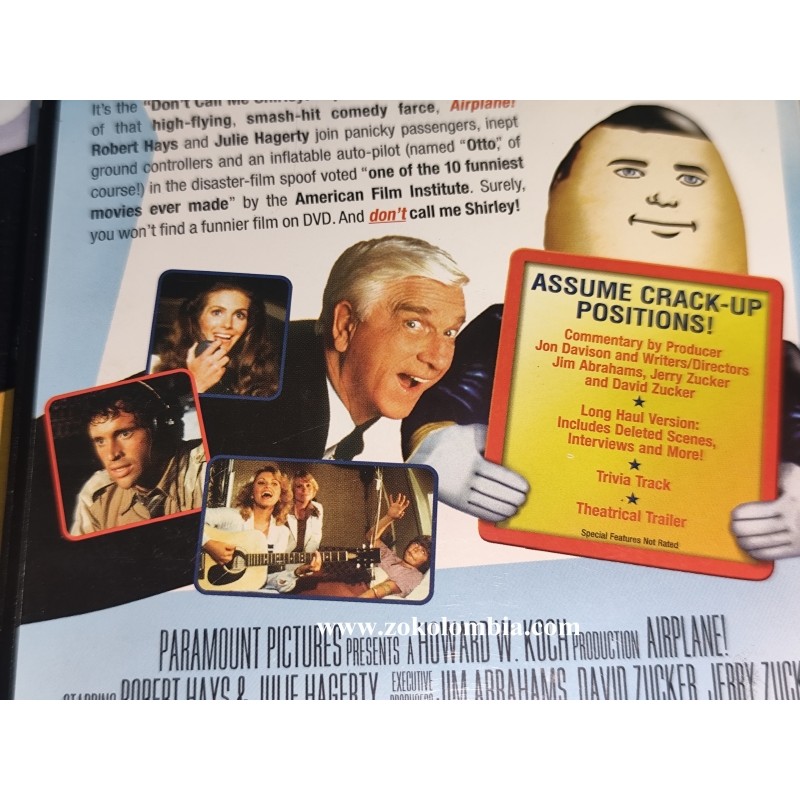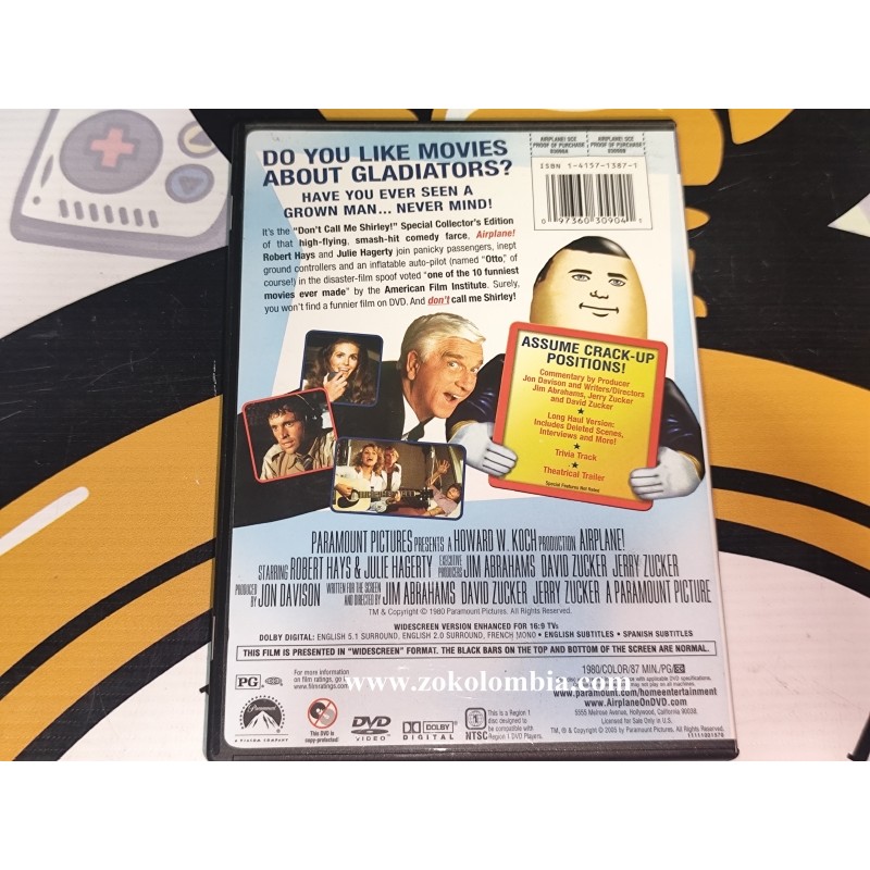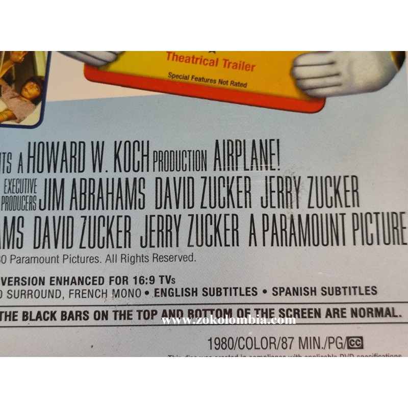Película original en formato DVD de Airplane! (¿Y dónde está el piloto?), presentada en su edición Widescreen Collection – “Don’t Call Me Shirley!” Edition. Un clásico absoluto de la comedia cinematográfica, reconocido por su humor absurdo, diálogos icónicos y ritmo imparable. Esta edición conserva su carátula original, contraportada completa y disco original, ideal tanto para coleccionistas como para amantes del cine de culto.