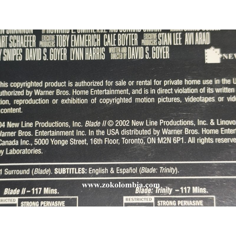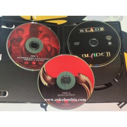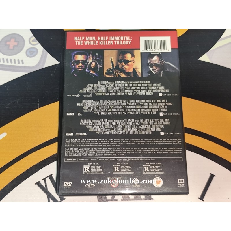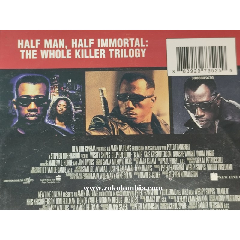 Blade Trilogy es una colección en DVD que reúne las tres películas protagonizadas por Wesley Snipes en el papel del icónico cazador de vampiros Blade. Esta edición incluye Blade (1998), Blade II (2002) y Blade: Trinity (2004), presentadas en un estuche compacto con arte oficial, ideal para coleccionistas y fanáticos del cine de acción y superhéroes.