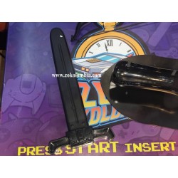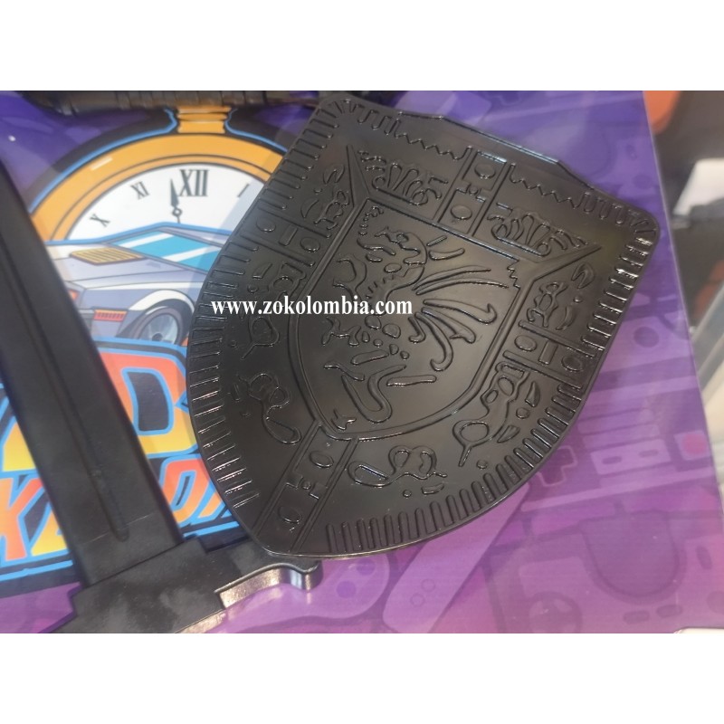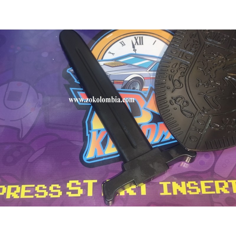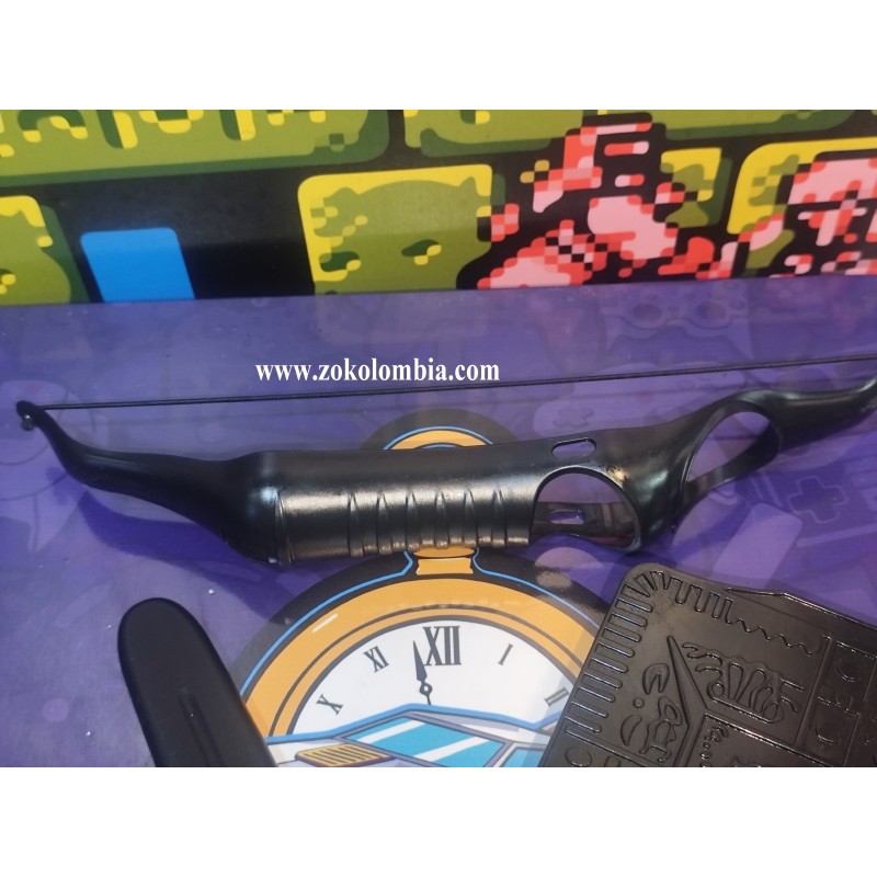 Set de accesorios del video juego Zelda para la consola Nintendo Wii, fabricados en plástico resistente, ideal para disfraces, cosplay, ambientaciones temáticas y colección. El conjunto incluye una daga corta con diseño clásico, arco compacto decorativo y escudo de mano con relieve heráldico, todos en acabado negro mate que aporta un aspecto sobrio y realista sin representar peligro real.